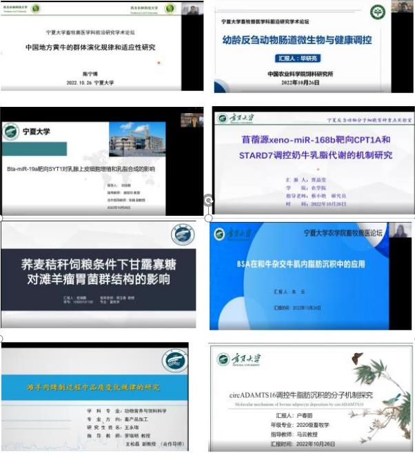 农学院畜牧兽医学科第一届研究生学术论坛以腾讯会议形式顺利举行。论坛聚焦畜牧、兽医学科发展前沿和研究热点,注重培养科学精神和科研素养,以助力宁夏畜禽优势特色产业发展为目标。学科邀请知名专家进行讲座和学生开展学术报告,以促进研究生对学科研究前沿和热点问题的了解,掌握学科最新研究方法和技术,培养科研思维,提升创新能力。