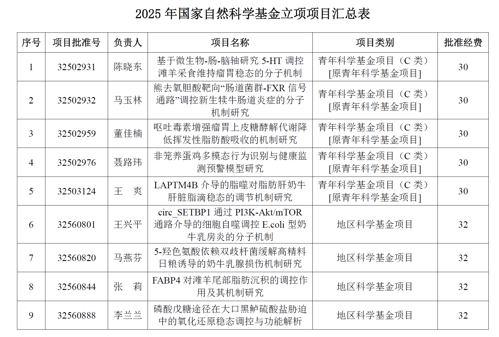 在全国基金申报竞争日趋激烈的背景下,凭借深厚的科研积淀、精准的培育举措与强劲的人才实力,再度斩获佳绩 ——共计 9 个项目成功获批资助,其中青年科学基金项目(C 类)5 项、地区科学基金项目 4 项,立项数量稳步提升,科研方向与地方产业需求高度契合,充分彰显了学院在动物科技领域的学科优势与科研竞争力。